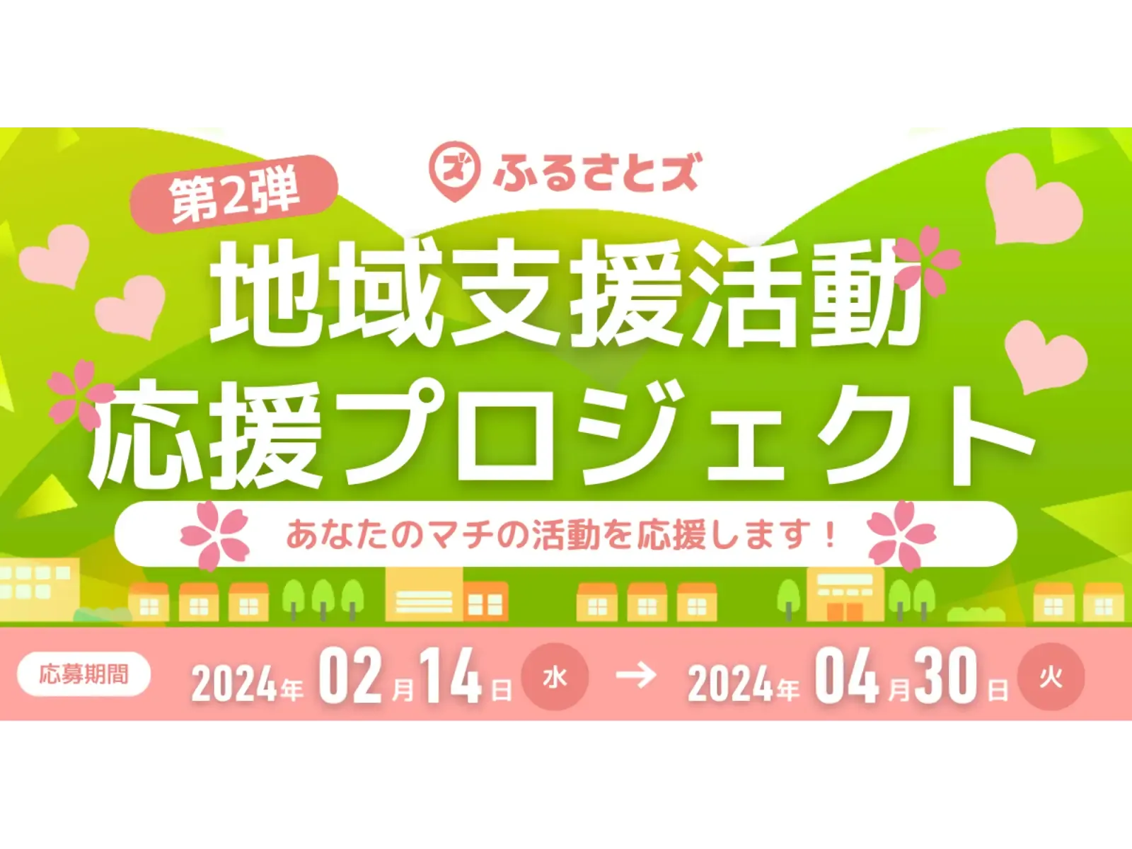 ふるさとズをご利用いただく多くのマチのファンの皆さまと共に、更なる地域づくりに貢献できるよう、2024年2月14日(水)〜2024年4月30日(火)までの期間中にご寄附いただいた金額の1%相当分を地域づくりを行っている皆さまへ『ふるさとズ』より応援寄贈します。