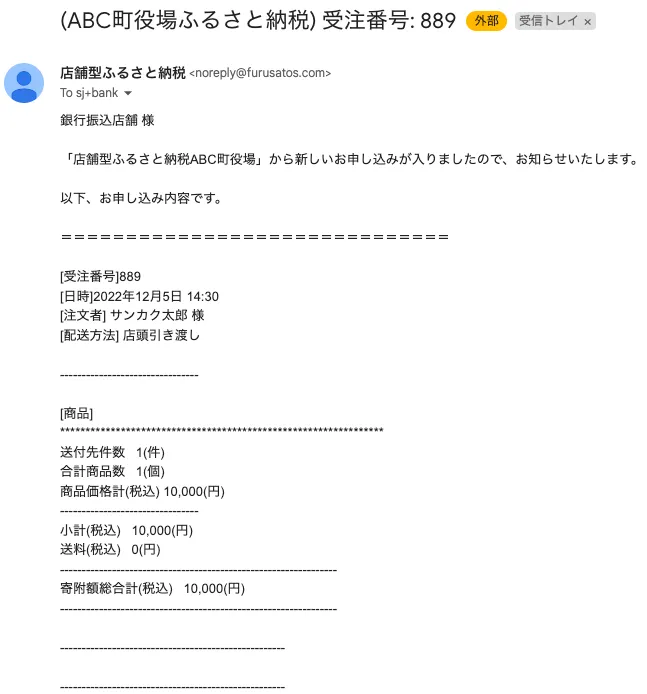 お客様が銀行振込を完了すると、自治体様および事業者様に下記注文完了通知が届きます。
