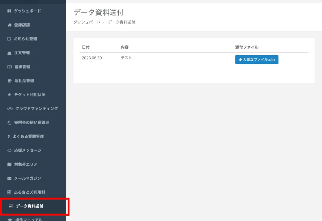 管理画面の 「データ資料送付」 から進むと一覧画面が確認できます。