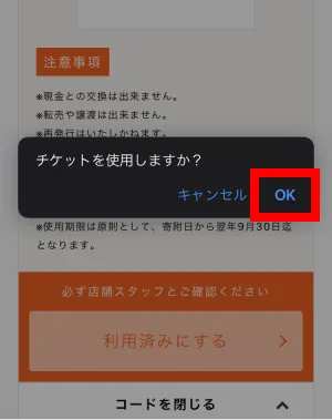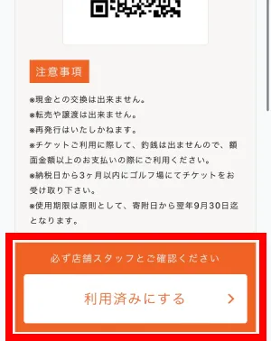 1. 寄附者さまのスマホで表示される二次元バーコード下の 利用済みにする ボタンを店舗さまと寄附者さま双方で確認しタップする