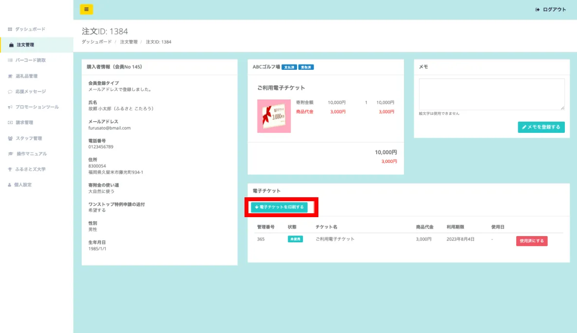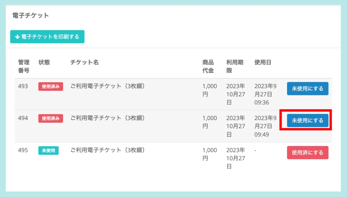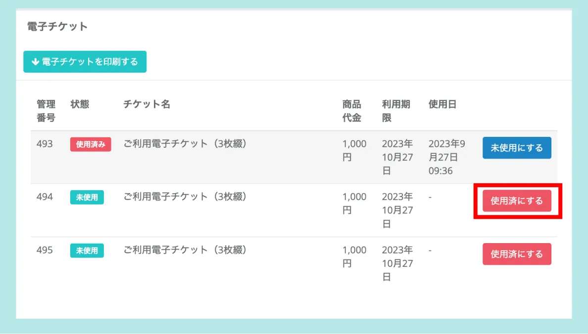1. 事業者さま管理者画面から該当の注文データにアクセスし、使用する電子チケットの 「使用済にする」 をクリックします。