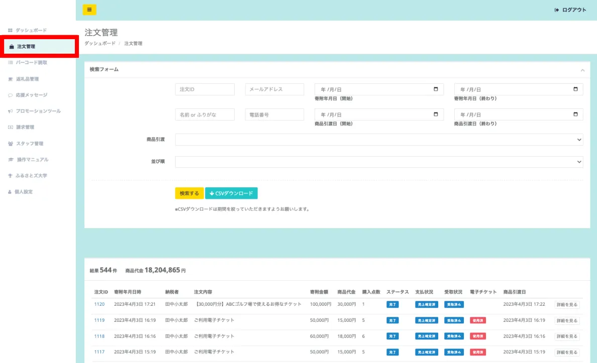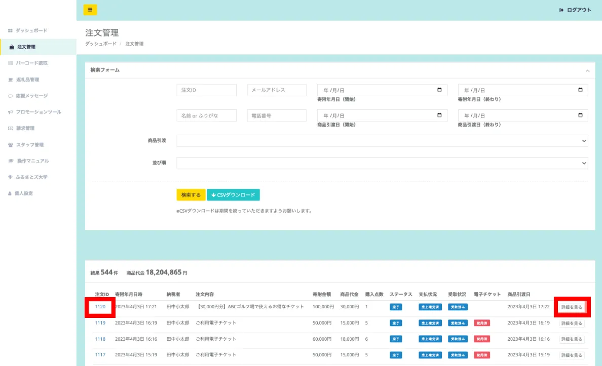 2. 該当の寄附者さまの [注文ID] または [詳細] をクリックする(注文詳細画面へ遷移します。)