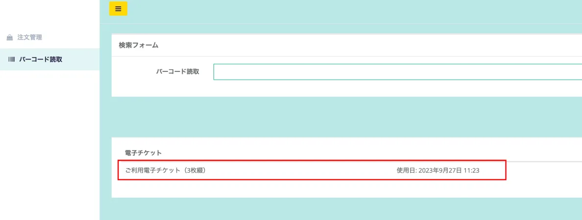 1. 事業者さま管理者画面から該当の注文データにアクセスし、使用する電子チケットの 「使用済にする」 をクリックします。