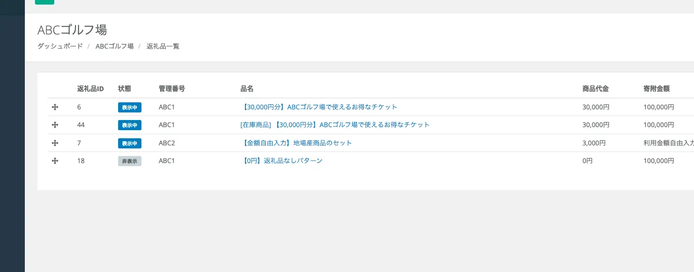 返礼品管理では、ふるさとズに掲載する返礼品の編集や削除、複製、並び替え、