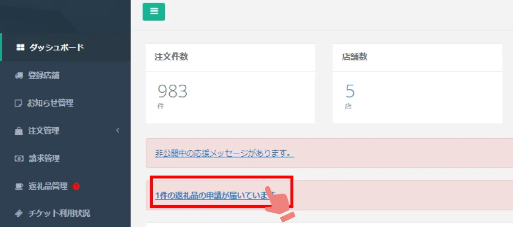 ※お知らせが届くとサイドメニュー「返礼品管理」の右側に赤のアイコンも表示されます。