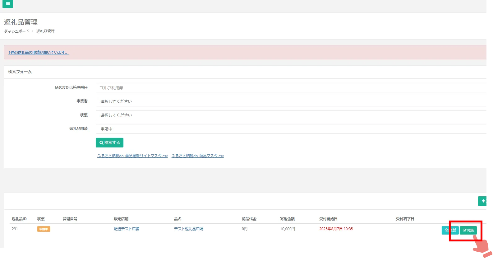 返礼品の削除は、削除したい返礼品の 「編集」 ボタンをクリックします。