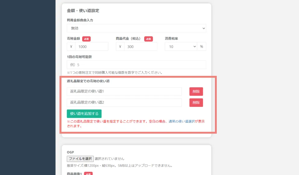 編集画面の 「金額・使い道設定」 内の 「返礼品限定での寄附の使い道」 に個別の使い道を設定します。